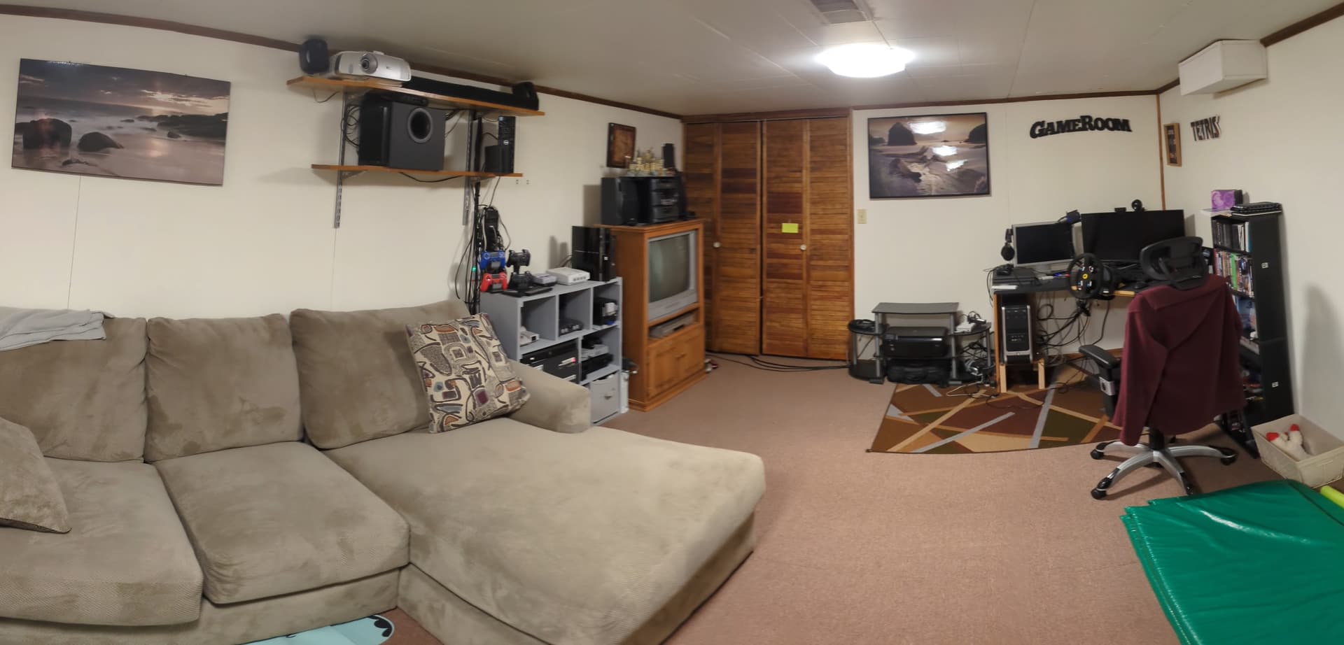 As for the setup: Everything analog uses component video and routes through an Extron switch to RT5X and CRT TV. Everything HDMI goes to a projector, capture card, and small TV (now our temp living room TV). All the switching may be manual, but it’s pretty straightforward. My wife and daughter can get the Roku routed to the projector every time. And they’ve learned how to get the GameCube routed for some Mario Party sessions. The PC has a Ryzen 7700X and RX6800 GPU, perfect for playing 1440p at the desk with keyboard+mouse or at 1080p on the projector with a controller. The wheel is for sim racing with friends for the winter months (I need to find a league that runs more).
